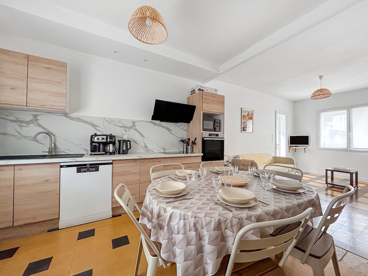*Maison individuelle située au coeur du village, restaurée, bien équipée, facile à vivre et à gérer. Sa conception permet à la fois des moments de partage et des moments de tranquillité. Son emplacement privilégié à la Halle, derrière la place centrale, tous les commerces autour, parkings, services pour se déplacer (plages, ville, gare). Autoroute à 7km, plages à 3km. Arrivée et départ autonomes. Linge et Wifi inclus. Ménage non inclus (ou en option sur place). Animaux acceptés sur demande.