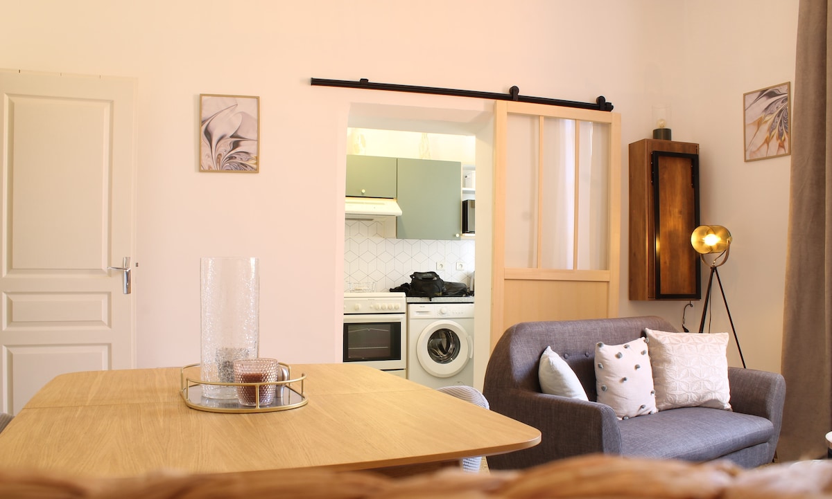 Studio moderne et confortable au RDC d'une maison de ville. À moins de 10 minutes à pied du centre historique de Narbonne, des Halles, des rues piétonnes et de la gare. Central, il offre un accès idéal pour découvrir la ville et ses alentours tout en étant situé dans une rue peu passante. Lit double 140x200 avec literie de qualité, cuisine équipée et belle salle d'eau. Parfait pour un séjour à deux ou en solo, que ce soit pour découvrir la ville ou pour un déplacement professionnel.