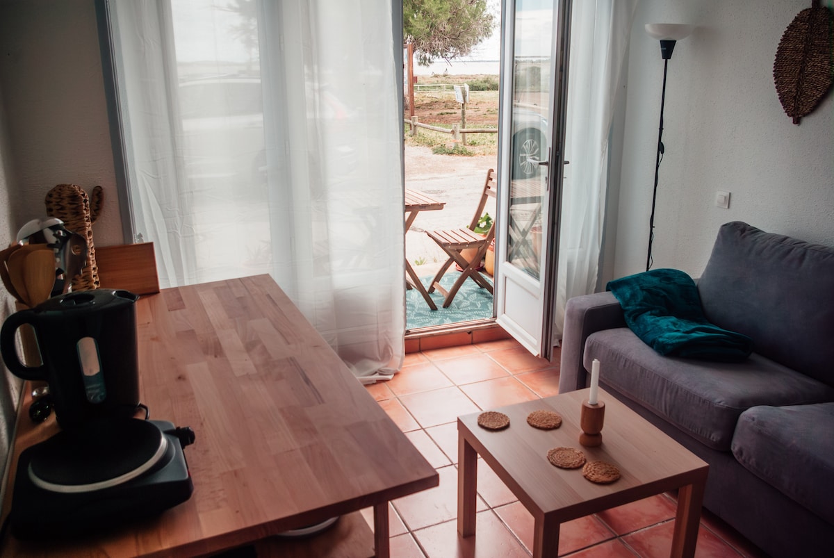 Nous mettons à votre disposition un logement au sein de notre lieu de vie, de 30 m2, à seulement 15 min des premières plages, 15min du Cap d'Agde et 40 min de Montpellier. Le logement dispose d’un coin salon-cuisine, d’une chambre et d’une salle d’eau-WC. Un grand espace extérieur sans vis-à-vis vous permettra de profiter pleinement du climat méditerranéen! Un coin à l’ombre vous permettra de prendre les repas, un coin plein soleil profitera aux amateurs de bronzette! 1 place de parking à dispo