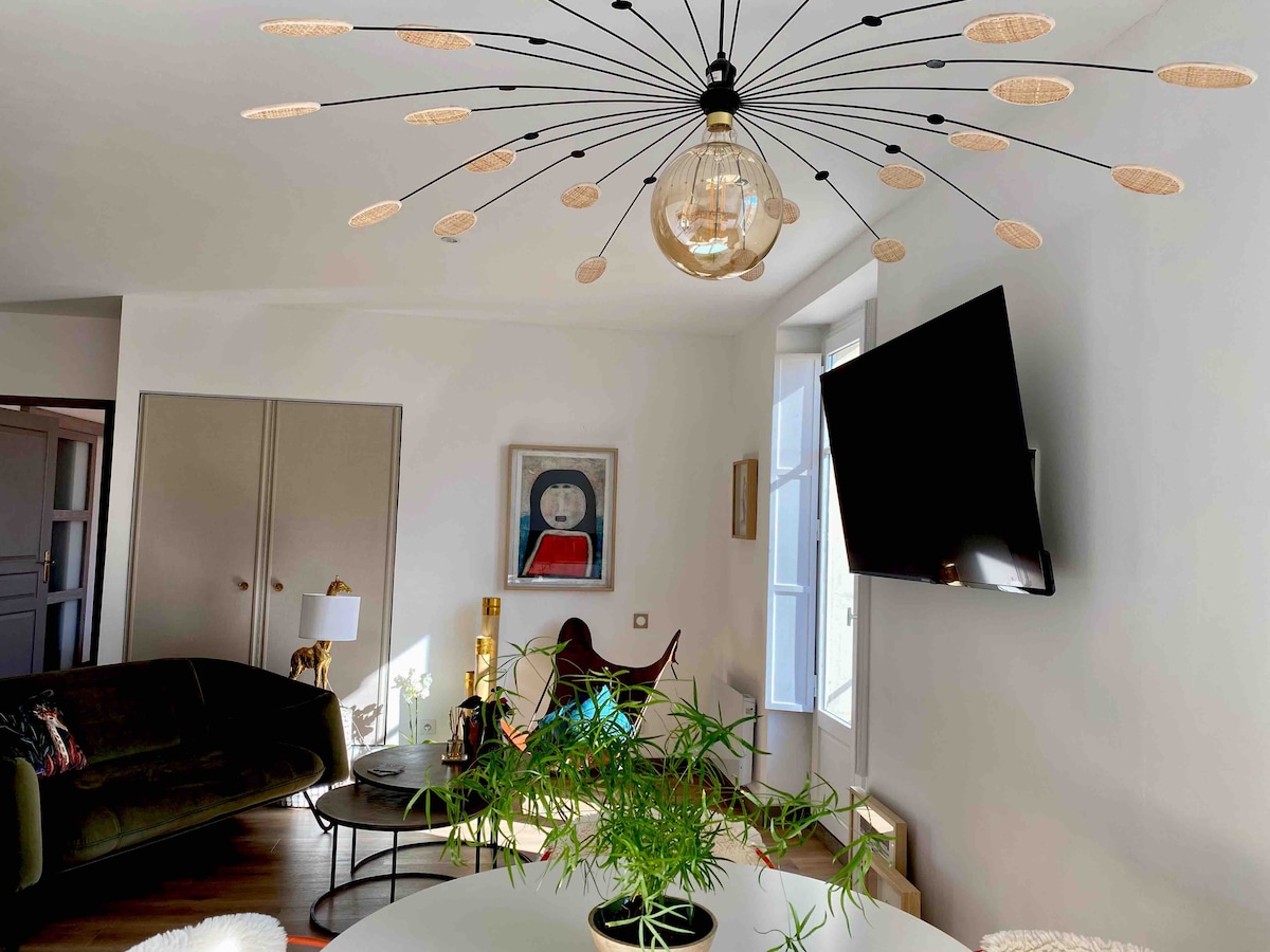 Centre historique de Narbonne. Au 1er étage d'une maison bourgeoise avec balcon et vue sur le canal de la Robine. Appartement climatisée. Grand séjour, cuisine équipée , TV LED, WiFi. Chambre 20m² : literie neuve, lit en 160 cm En longeant le canal vous êtes à 8 mn à pied du centre historique de Narbonne ( Hôtel de ville, Cathédrale, les Halles, restaurants, bars....) 10 mn à pied de la gare. 10 minutes en voiture des Grands Buffets. 20 mns en voiture des plages de Gruissan et Narbonne plage.