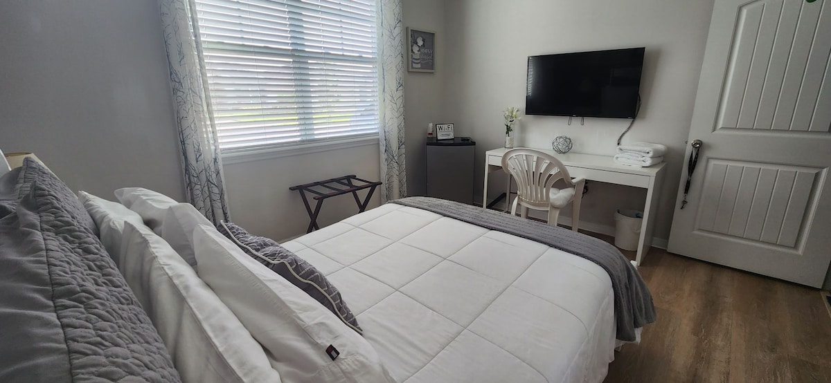 A spacious cottage - not 2 bedroom.. (2 beds means one King and one air mattress in the closet if needed) nestled in a garden with another across the courtyard. Large bathroom. Gated entrance and free parking space outside the gate. Can accommodate a boat. We built this retreat originally to accommodate our senior family members those but they are unable to settle in St. Cloud yet. The current plan is to continue to provide a comfortable retreat for the community without the over charge.