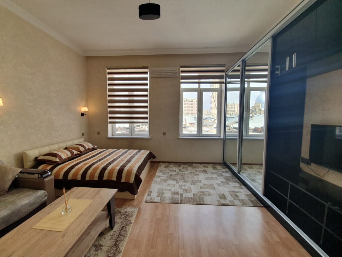 Newly renovated beautiful studio apartment is situated in the heart of city and it has a short WALKING distance to the main sights like Targovy or Nizami Street (2 min), Seaside Boulevard (2 min), Old City and etc. as well as very easy access to public transportation (2 min walk to Sahil Metro s/t).The apt. is ideal for couples & has all premises to make your stay safe & comfortable with an equipped kitchen, washing machine, bath essentials, AC, hygienic bed linen&towels, full-size bed, elevator