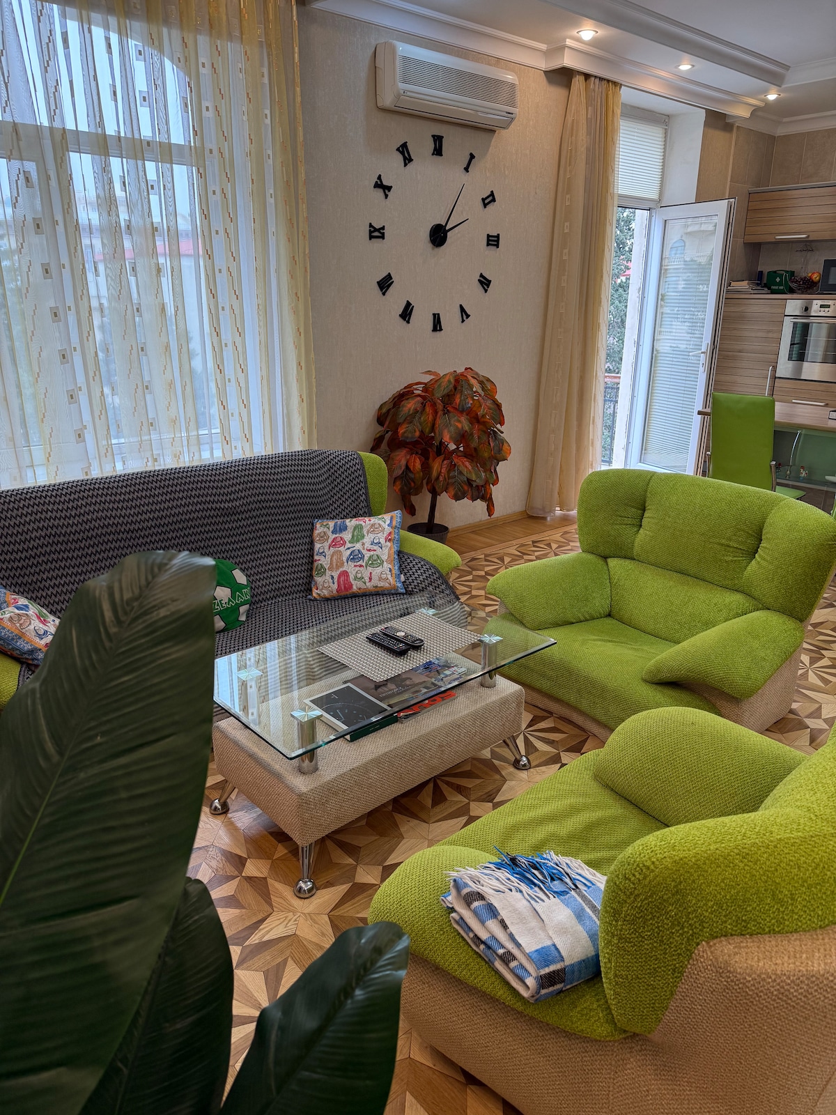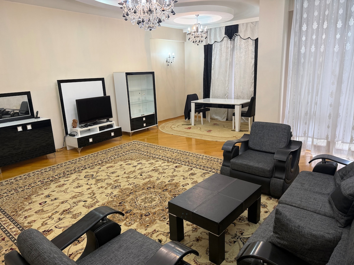 Heart of Baku: Spacious 100m² Apartment near Fountain Square This 100m² apartment in the “House with Angels” is just one flight above a bustling street in downtown Baku. Enjoy city life from the balcony or take a quick walk to Nizami Street and Fountain Square. With high ceilings, modern amenities and a glowing 4.97 guest rating, this bright, stylish home has everything you need and promises a comfortable stay in downtown Baku