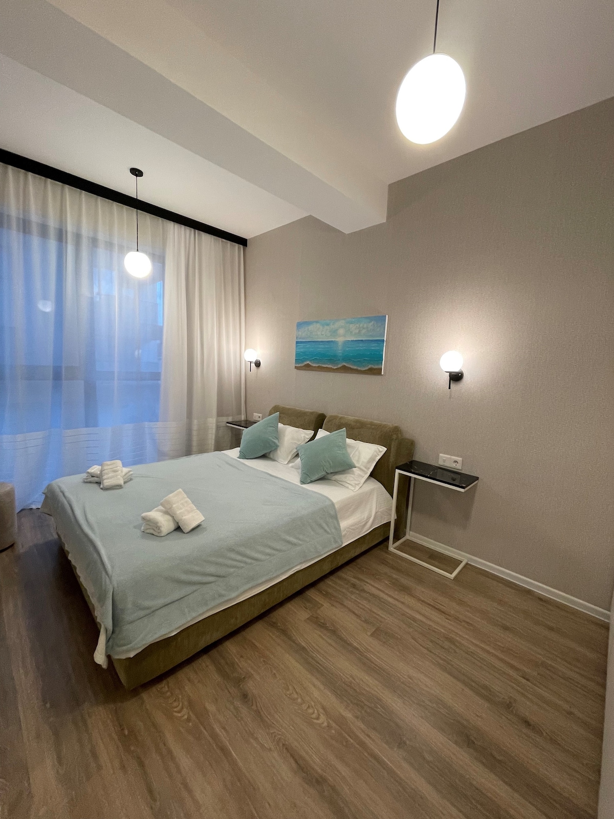 The apartment is located in the city center. It is a 10-15 minute walk to the Old city, Crystal Hall. The house is located in a high standard residence surrounded by a supermarket, fitness center, various restaurants and bars. The apartment itself has a SEA view, is new and equipped with all the premium equipment necessary for living. These include washing machine, iron, air conditioner, TV and more. I am sure that it will be an ideal place for couples or friends who come to Baku on vacation.