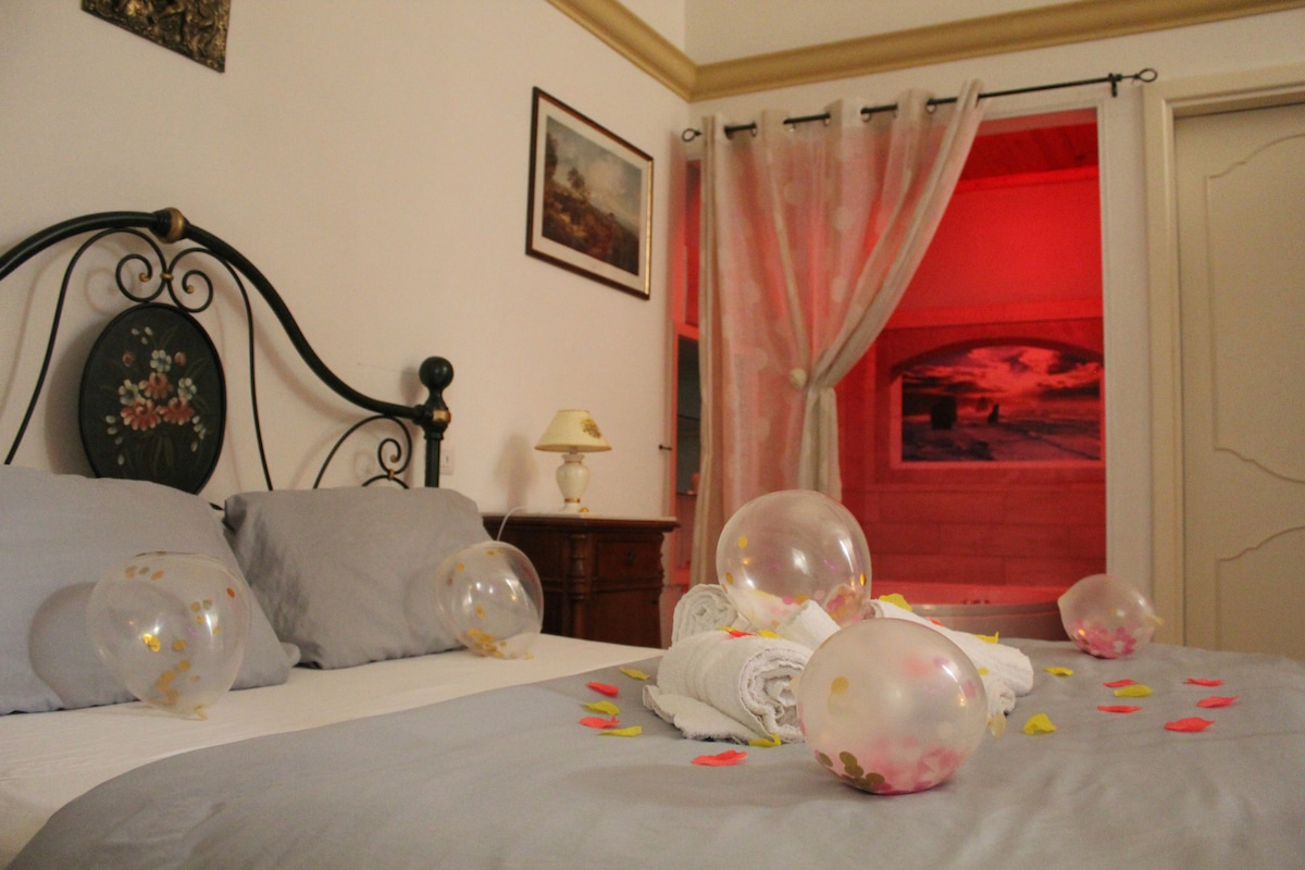 The room features a double bedroom with a shower corner surrounded by original stone walls and equipped with a chromotherapy system. It boasts floor lighting, a skylight on the barrel-vaulted ceiling, and an ancient fireplace. The suite is also equipped with air conditioning/heating, mosquito nets, bath and bed linens, a fridge, TV, Nespresso coffee machine, and a single induction hob for quick meals.
