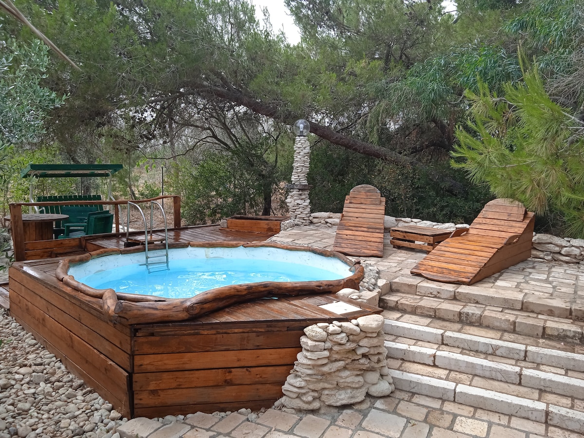 Baita in legno con piscina immersa tra bosco uliveto secolare e orti biologici a disposizione degli ospiti Ci sono letto matrimoniale un divano una cucina con aria condizionata.il bagno a ridosso della baita é situato all esterno ampio e confortevole All'esterno un area relax una doccia esterna un barbecue e piscina struttura ideale per i mesi estivi adiacente alla casa patronale ma é totalmente indipendente il mare dista poco meno 1 km in localita torre rinalda 9 km da lecce