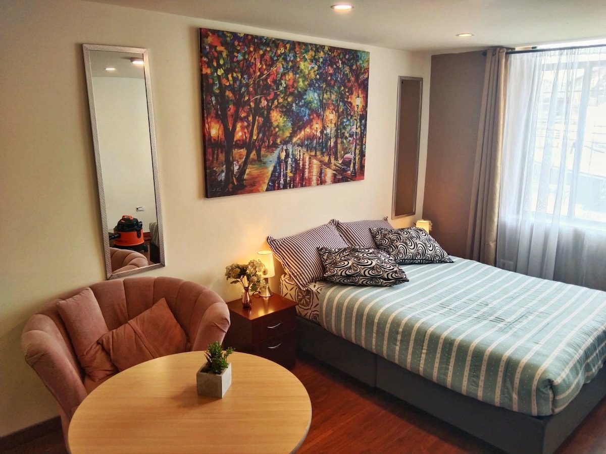 Aparta estudio amoblado con todo lo necesario para que disfrutes de una agradable experiencia, cuenta con servicios de Internet, Agua, luz, y gas Excelente ubicación, cerca a 5 hospitales , zona rosa de la Cuidad, 5 universidades, servicio de Portería. Servicio de lavandería, sala de cine, zona bbq , salón de eventos por un costo adicional, TV Android con Netflix. Encantados de recibirte en nuestro alojamiento.