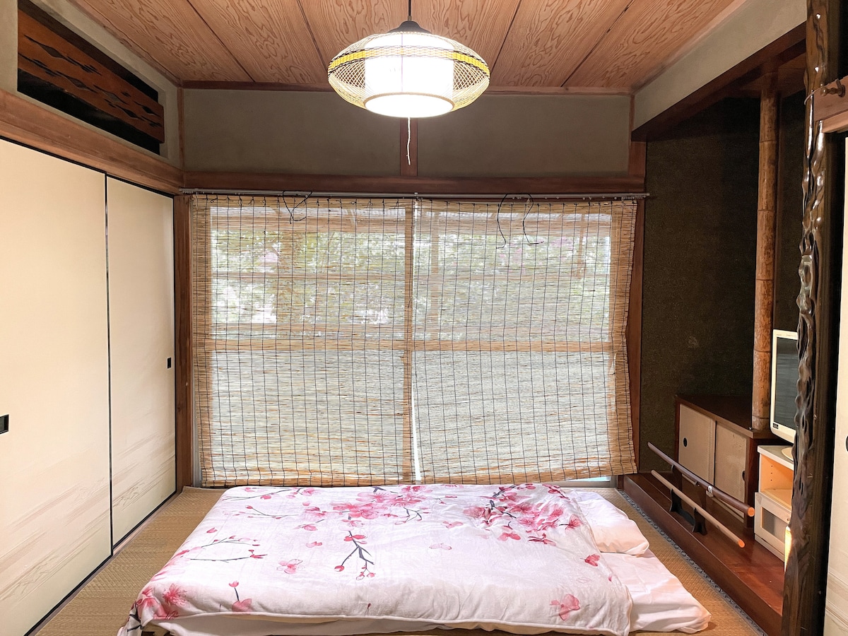 成田空港から1駅、成田駅から徒歩5分にある一軒家です。 最大宿泊人数は9人まで。 カップル、ご家族、大グループでのご利用に最適です。 ※2階部分にホストが住んでいる部屋がありますが、家を丸ごとゲスト専用で宿泊したい場合は、ホストは違う家に住みますので遠慮なくお知らせください 築60年ほどの伝統的な日本家屋です。 きれいにはしておりますが、床の軋みや柱の色あせなど行き届いていないところもありますことをご了承ください。 また、周辺は緑が多いため虫が出ることがあります。苦手な方は宿泊をお控えください。 JR成田駅から徒歩で約5分。さらに徒歩30秒でメインストリート(参道)に着くので、レストランやバーには困りません。いつも観光客でにぎわっており、お土産屋もたくさんあります。 リビングには大きな桜の木があり、自然豊かな庭もあります。閑静な環境なのでリラックスして過ごすことができます。 合計で3部屋の寝室には、10㎝の厚みのある布団があり、すべてセミダブルなので快適に眠ることができます。