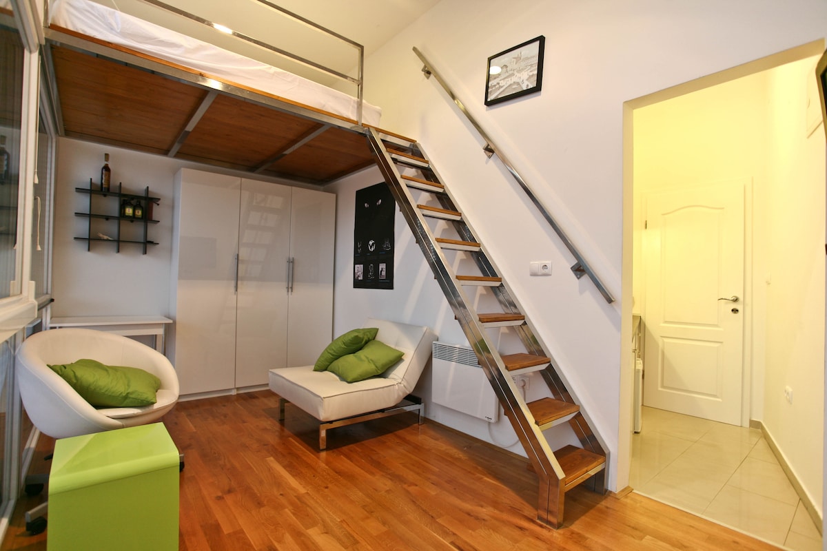 This is small apartment in the 4th floor of historic building (no elevator). Apartment isn't big, but has a smart design and is located in the central part of pedestrian zone - this is also the most prestigious location of Old Ljubljana. For a fair price you are getting exclusive location with gorgeous views over Ljubljana's heart. This is for everybody who appreciate clean apartment, central location, bright spaces, view on the city castle. 9. Parking costs 15€/day. Mind it has a loft bed.