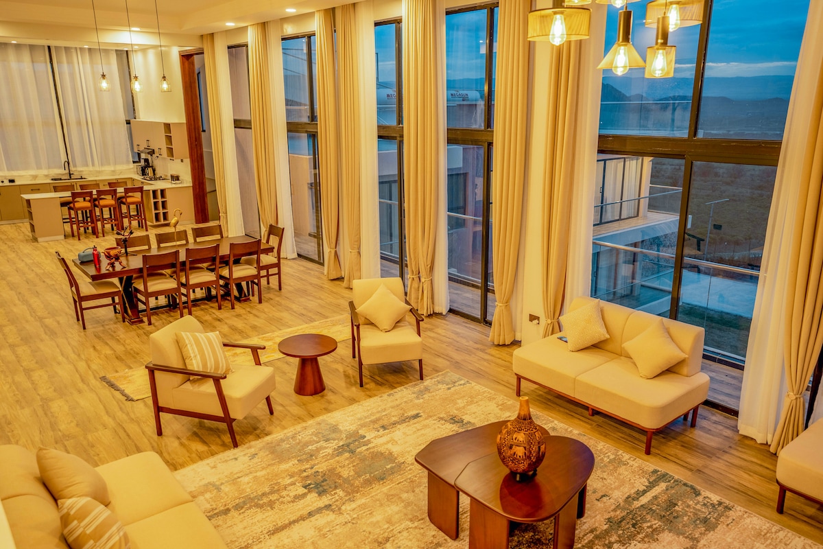 A grand 4-bedroom lake-view retreat offering elegant interiors, spacious lounges, a full kitchen, and private comfort. Perfect for families and groups. Enjoy access to the villa’s pool, padel court, mini-golf, gardens, bonfire area, nature walks, and optional private chef. A luxurious escape on Lake Elementaita. Bring the whole family to this great place with lots of room for fun.