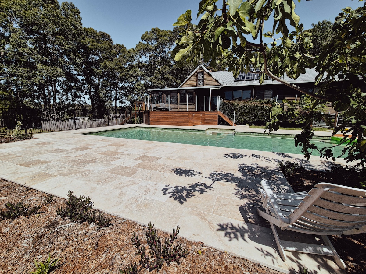 Bawley Ridge Cottage is a secluded, spacious & dog-friendly log cabin with lofty beamed ceilings, cosy living area, & luxury bathroom. 10 mins from Bawley's beaches, the cottage is on an 8 ac farm, with roaming alpacas, geese, peacocks & goats. We have lots of wood for the fire in winter, the outdoor bath is wonderful for stargazing & the (shared) swimming pool heaven on a hot day. We can also provide transport at a competitive fare to & from nearby walking trails, wedding venues & wineries.