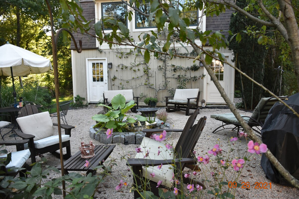 This peaceful and centrally-located place is a sunny and spacious modern one-bedroom cottage located in the heart of historic Wakefield. We're minutes from many RI beaches. Stroll downhill to a lovely park on Saugatucket River, then cross the charming footbridge into town. Here you'll find a variety of restaurants, cafes, and ice cream, plus excellent community theater, yoga, and interesting shops. Relax inside this light-filled home or sit out on the deck overlooking the gardens and town.