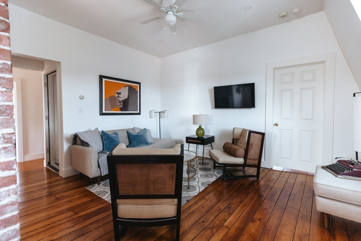 Our PENTHOUSE SUITE : a contemporary 3 bed room apartment for 5 guests with Harbor view and recently renovated kitchen. 🐶 💕. This open floor plan, contemporary decor and private deck with views of Newport Harbor makes this loft the perfect place for your vacation retreat. 2 freshly renovated full bathrooms, stocked kitchen with marble counter stones. Living room & dining room with Contemporary Antiques - stay in Newport's most desirable hot spot & includes 2 free off-street parking spaces