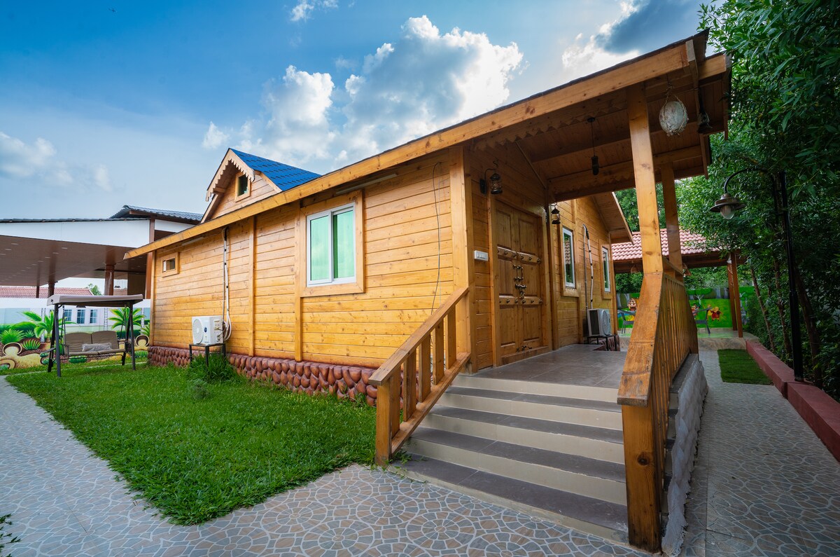 Vistara offers a grander wooden cottage experience inside AV Holistays, designed for larger families, groups, and special celebrations. With expansive indoor spaces, open lawns, and full access to all resort-style amenities, Vistara blends rustic wooden charm with premium comfort — making it ideal for group getaways, celebrations, or even intimate events — all within a short drive from Hyderabad.