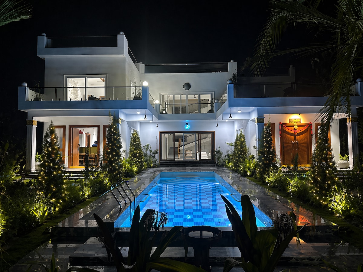 Welcome to our brand new stunning 5-BHK luxury farmhouse, an artistic haven nestled in nature. This beautifully designed retreat blends modern elegance with rustic charm, featuring spacious living areas adorned with artistic touches and large windows that invite the outdoors in. Enjoy our dedicated play area, perfect for family fun, while the serene surroundings offer peace and relaxation. Unwind on the outdoor deck, savoring breathtaking views at sunrise /sunset or under the stars.