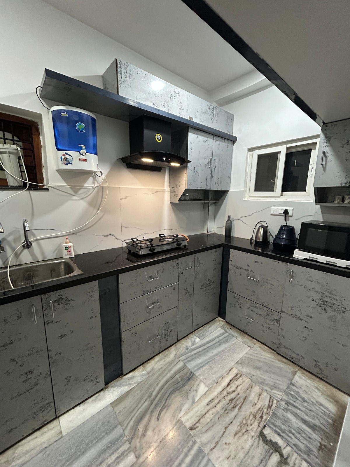 BLUO STAYS - Award winning Sanitized Homes! Newly designed 1BHK for Single Executives/Couples working in Gachibowli, Hitech City & Jubilee Hills with Terrace Garden & Lift. Best for Work From Home - King Bed in Bedroom, Work Desk, Bathroom, Couch seating & Dining Table in Living Room & Fully loaded Kitchen with Stovetop Gas Refrigerator, Microwave, cookware etc. All-inclusive Daily Rentals - WiFi Internet, Netflix/Tatasky , Cleaning, Washing Machine, Utilities, Parking , 100% Power Backup.