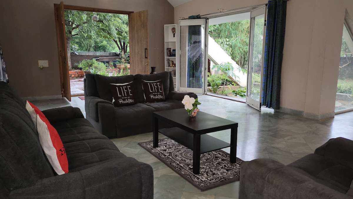 Welcome to The Airport Villa—an exclusive 2-bedroom luxury home with full air-conditioning, located in Shamshabad near NH-44. Perfect for families, corporate stays, private events, and film shoots. Bookings are not allowed for unmarried couples or mixed-gender groups. Guests can enjoy fast Wi-Fi, peaceful teak-lined outdoor spaces, and stylish interiors. A gentle 5-year-old German Shepherd also lives on the property in a separate house.
