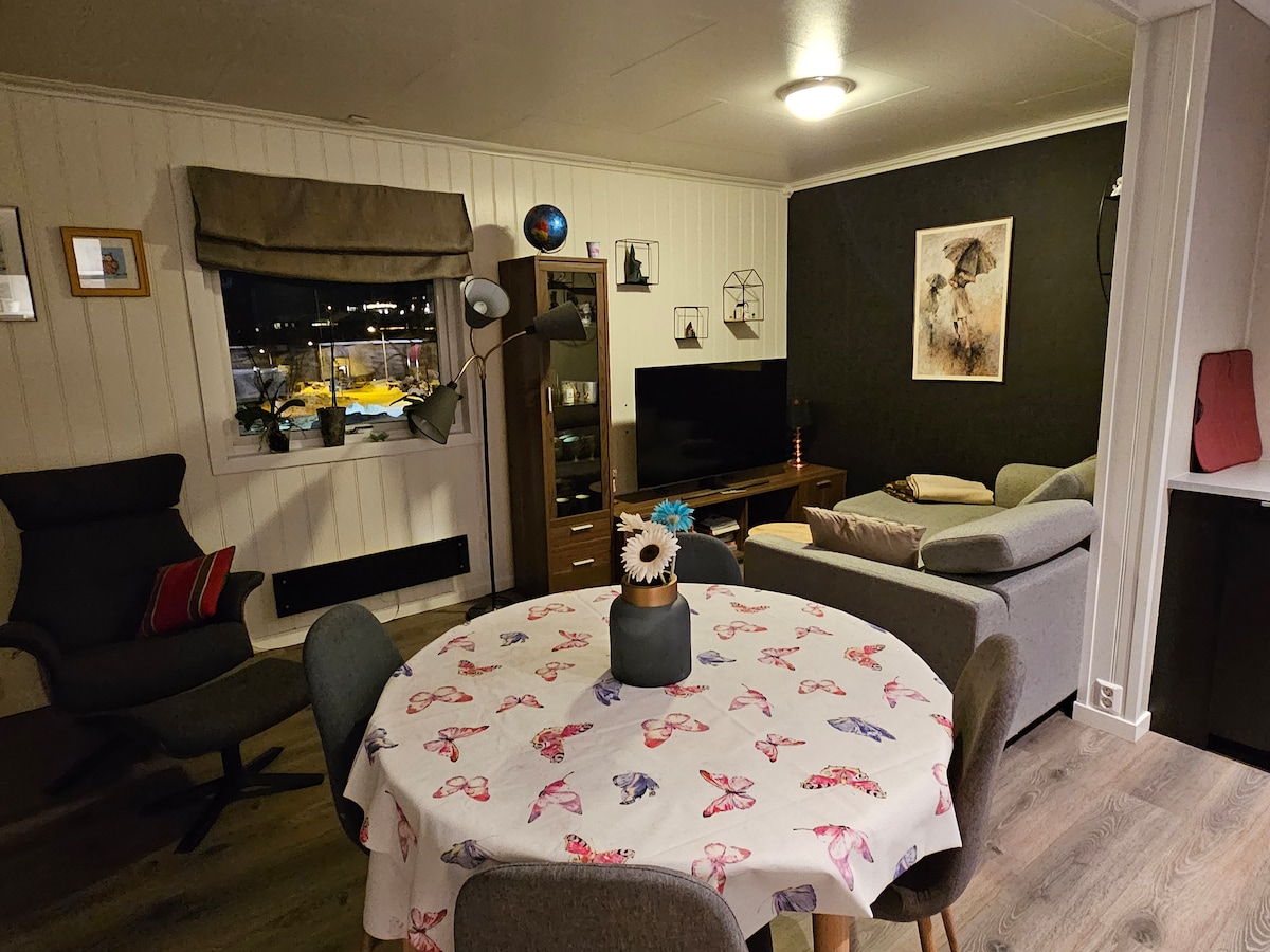 Studio apartment separate entrance. Windows facing a garden and the midnightsun/ sea / northern lights. Gardentable, garden chairs. Doublebed 150cm High speed wi-fi, cable tv. Kitchenette, two plates stove. Tea & Coffee and BREAKFAST included. Microwave, Fridge/freezer necessary equipment. Dinnertable for two. Bathroom with window. Washing machine + dryer. Located in central Narvik in a quiet part of town. 9min walk city center, railwaystation and flight bus. 3min walk to a small beach.