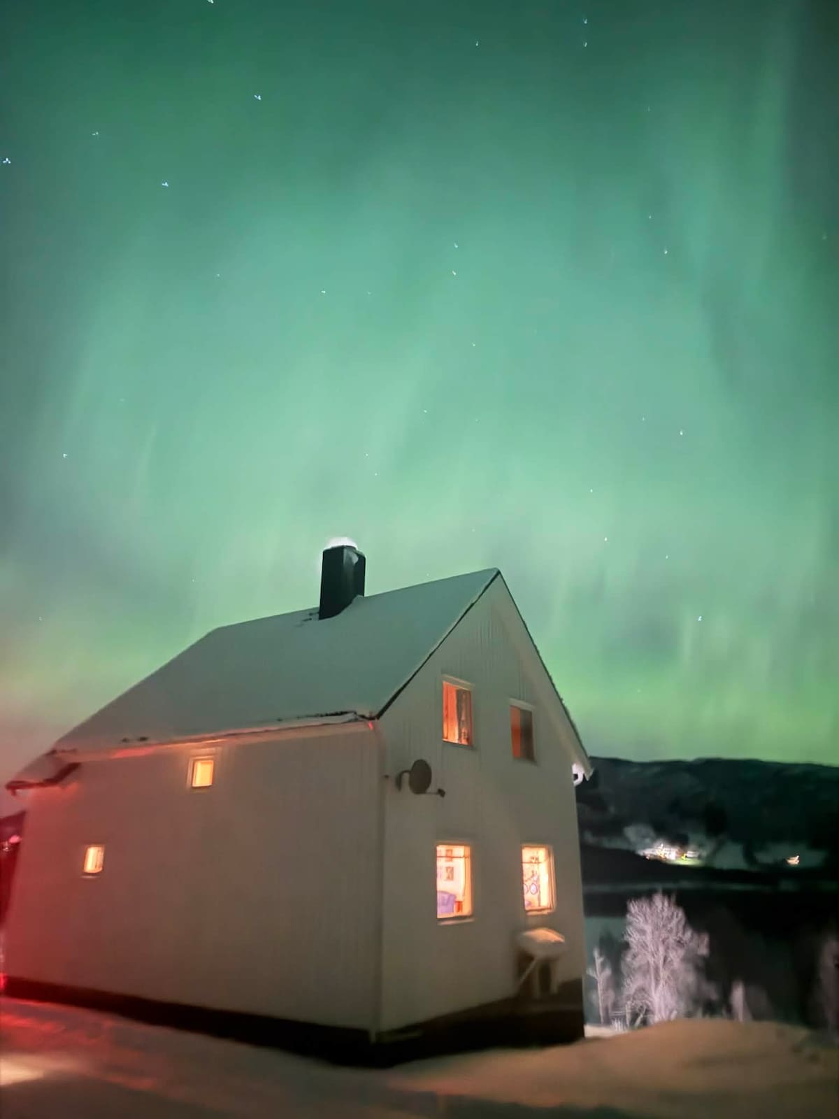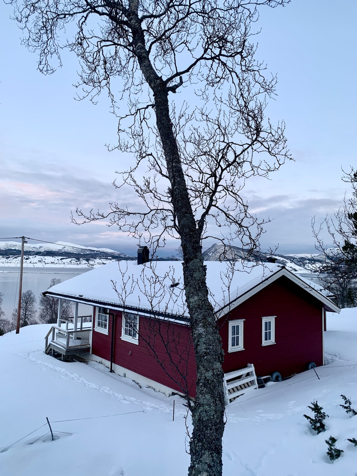 Beautiful cabin surrounded by breathtaking Norwegian nature. Winter time you have a great chance of seeing the aurora borealis. Summer you can fish salmon and trout 100 meters from the cabin and you're surrounded by mountains that can give you lifelong memories The shower and washing machine are located 200 meters from the cabin in one of the main houses.