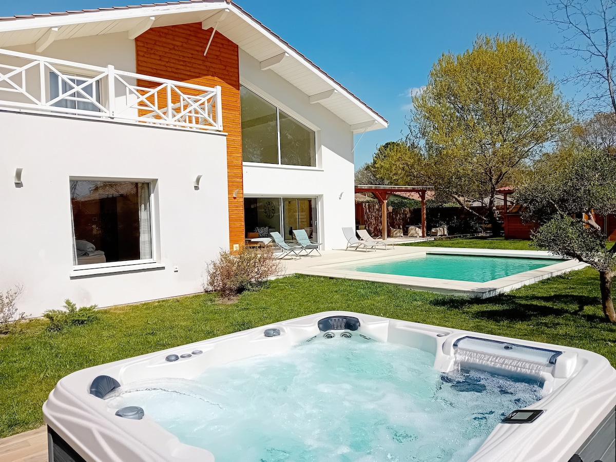 Maison de 140 m2 mitoyenne par le garage, à la décoration soignée, deux terrasses, une piscine 6/3 sécurisée par volet, un spa Sundance 4 places, un espace bar et plancha. Située dans un quartier calme. Idéal pour passer des vacances tranquilles, profiter des joies et des activités de l'océan, du Pays Basque et des Landes. Commerces, restaurant et plages à pied. Possibilité de stationnement pour 3 voitures dans une allée privée.