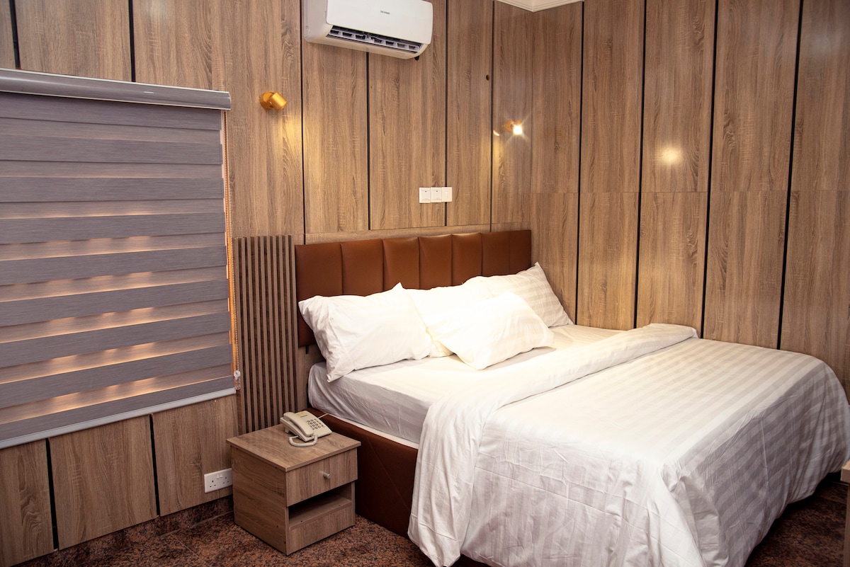 Experience the best of Abuja in our serene one room which gives off an uplifting energy. With soft lighting beneath the bed and warm tones, it brightens up your stay for a truly relaxing experience. Enjoy a restful night's sleep on our plush queen-size bed, stay entertained with smart TV and Netflix, and stay connected with fast Wi-Fi. Enjoy a private attached bathroom with a heater for a warm cozy bath and mini fridge. Perfect for solo travelers, getaways, couples, and business executives.
