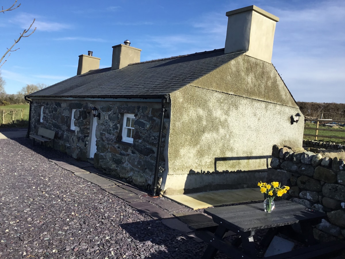 Cwtyn is a detached,stone built former swill house,used to prepare pig feed in the 19th century. It has been converted into a cosy self-catering cottage whilst retaining the original stone fireplace and slate hearth. It is now an open-plan space,compact and practical, with bathroom, kitchen, log burner,TV and Wi-Fi. Outdoors there is an enclosed space,slate patio,seating,fantastic views and private parking. Rural,peaceful and unique - a great base for exploring Snowdonia,Anglesey and Lleyn.