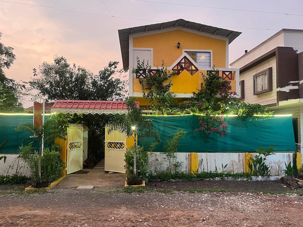 Relax with the whole family at this peaceful place to stay. A lovely 2 BR property in the midst of nature. 2 King-size beds (sleeps 4). 4 extra mattresses. Air-conditioning in both bedrooms and living room. A kitchenette consisting of tea-coffee maker, micro-wave oven, refrigerator, a set of 12 plates, glasses etc. TV+DTH. Lush 3000 sq ft of lawns. Free Parking for 6 cars. Outdoor sit-outs with beautiful views. Indoor Board Games. Bluetooth Karaoke Speaker. Inverter back-up for lighting load