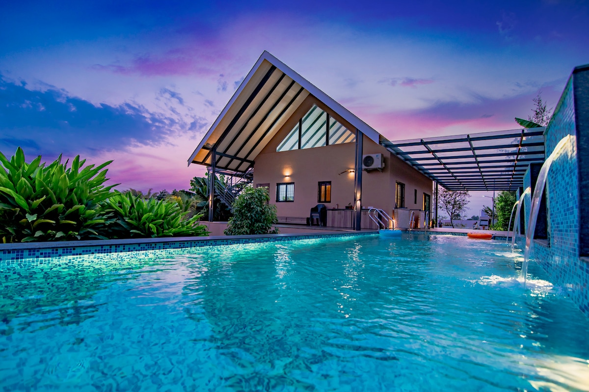 Boutique Villa - Tucked away in quite corner surrounded by vineyards, for guests looking for perfect place to retreat, Roseate Villa is the destination. The Roseate Villa is a 3-bedroom pet-friendly villa in Nashik is an ideal getaway for guest seeking bespoke hospitality. The villa has three bedrooms, all spread across the ground floor with ensuite bathrooms equipped with modern amenities and views of grape plantations. Entire villa with a caretaker, pool, lawn sit-outs, Wi-Fi & parking