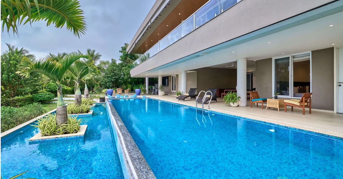 A Palatial 5 BHK Luxurious AIRCONDITIONED Villa with KING SIZE beds, large living room, to host big family and group stays. Max up to 20 guests allowed including children. All bedrooms have attached large bathrooms + 2 additional baths. The villa has PRIVATE POOL+GARDEN with beautiful ornamental floral plants and fruit trees, spacious open lawns and a large GAZEBO. Indoor games like TT, Carom, Chess, T-Foosball is available along with TV and TataSky.