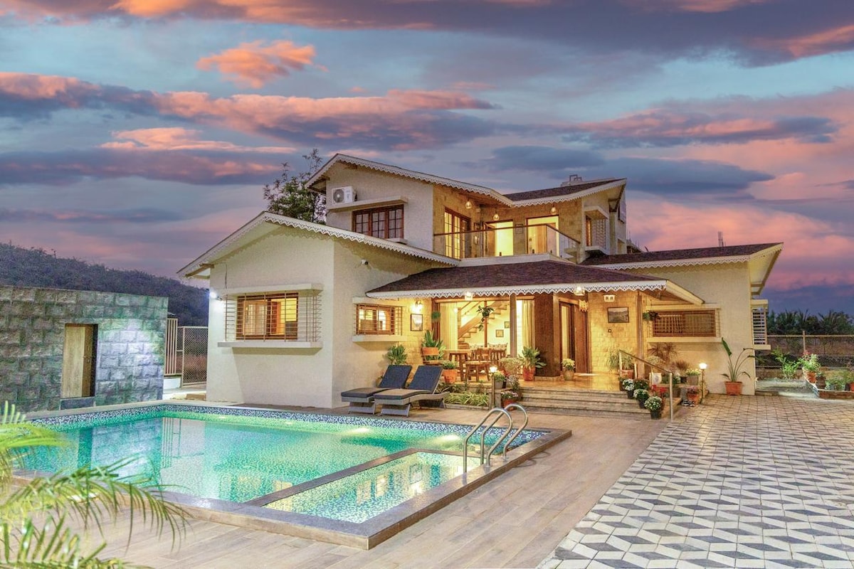 🏡 4BHK villa nestled in the serene Anjaneri Hills, just 25 mins from Nashik and 2.5 hrs from Mumbai - Sleeps 8–16+ guests, features a private pool and 4.5 baths - Spacious living and lounging areas with a cozy mini bar setup - Fully equipped kitchen and elegant indoor dining space - On-site chef available (extra charge) for delicious meals or BBQs - Pet-friendly property🐕🐶 Perfect for family getaways, special occasions, or peaceful retreats near Sula Vineyards🍷and Trimbakeshwar Temple.🛕