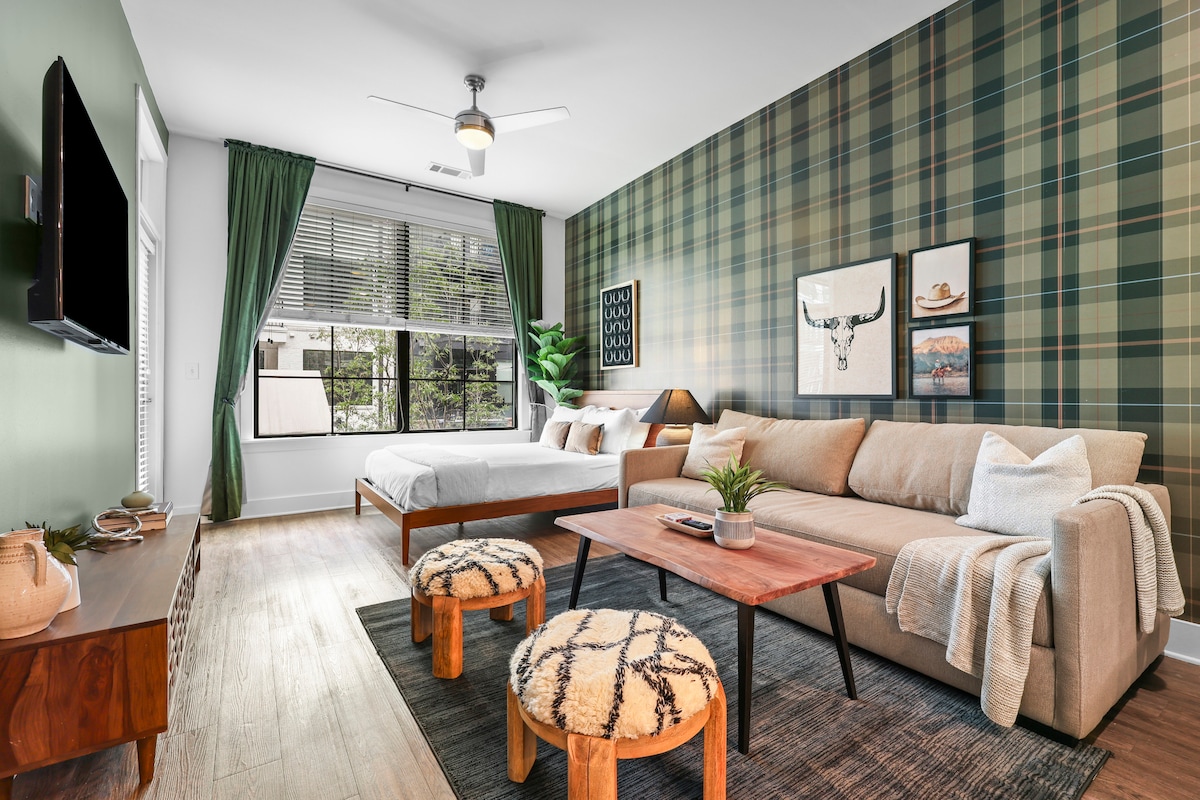 Relax in a bold, indulgent downtown escape featuring custom design and eclectic decor just 2 blocks from Broadway. The spacious residence features a KING bed and QUEEN pullout sofa bed, full kitchen, coffee bar, and free parking. Guests enjoy access to an outdoor pool, fitness center, climbing wall, and courtyard with grills and fire pits. Relax on your private city-view balcony with coffee or evening sip of wine! Brand new space-hosting additional properties in same building! STR2018073468
