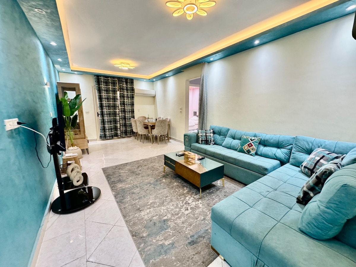 Welcome to my lovely Charming Luxury apartment! My Apartment located in Luxury safe Compound with very good wide Garden and Kids Area. Enjoy modern elegance 2 Bedroom , complete AC, and comfort. Stylish living area, fully equipped kitchen. You'll love the stylish décor and cozy atmosphere, which makes it the perfect home away from home. *High-speed internet. *10 mins to City Center Almaza Mall *15 mins Cairo Festival Mall *15 mins to Airport Book now for a delightful stay!