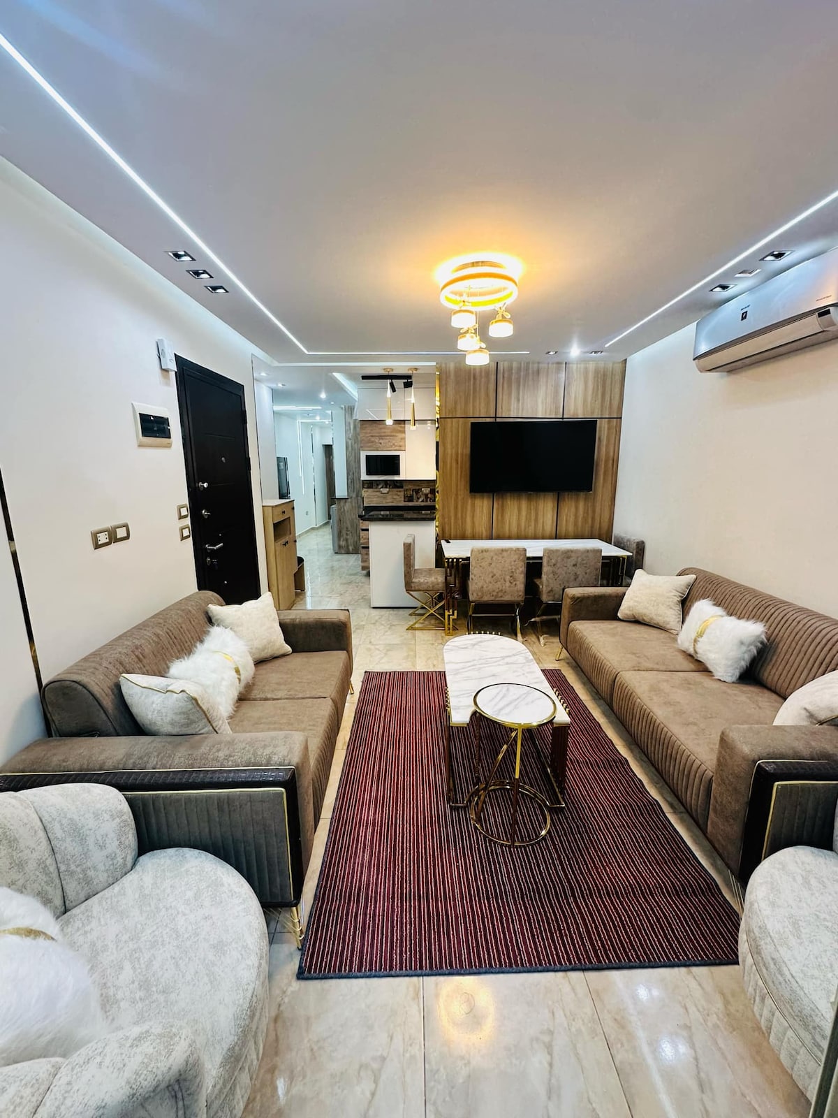 Welcome to my luxurious apartment in Taj Sultan, a premium and secure residential compound. Apartment Details: 2 bedrooms Cozy living room Fully equipped kitchen 2 full bathrooms Fully air-conditioned Features: Stylish decor & relaxing vibes High-speed internet Location: 15 mins from airport 15 mins from Cairo Festival City 10 mins from City Centre Almaza Book now for a great stay! Marriage proof required for Egyptians/Arabs, valid ID needed, no visits allowed, smoking on balcony only.