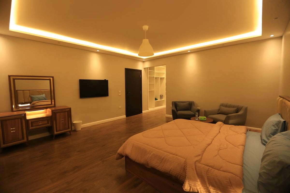 Beautifully designed luxury apartment . Private floor 2400 sq ft . A perfect getaway for family/individuals looking for neat well furnished stay in Ard El Golf- Heliopolis Cairo. A panoramic garden view along with sunshine specious area served with fully air conditioning (cold and heat). Inspired high standard amenities. Welcoming neighborhood. Metro station is 8 mints walking distance, Famous shopping malls and groceries are quite near. All over, nothing is better than a unique safe location.