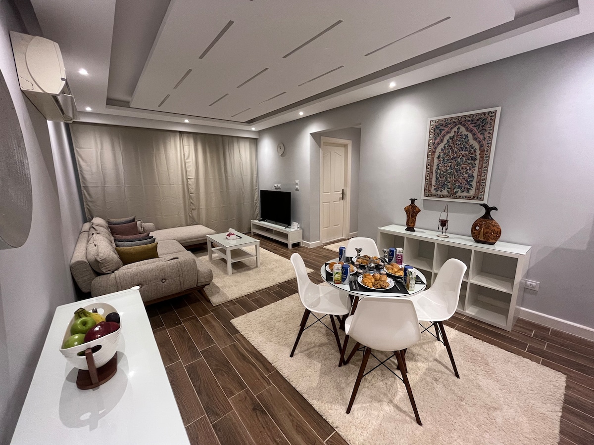 ✨ Experience luxury living in the heart of New Cairo! This elegant 2-bedroom apartment combines modern comfort with stylish design. The open-plan reception features plush recliners, a fully equipped kitchen, and a sun-lit dining area perfect for shared meals. Both master bedrooms offer king beds, ample storage, and cozy touches for restful nights. Step out to your private rooftop garden terrace with sweeping city views, an oasis for yoga, reading, or morning coffee.