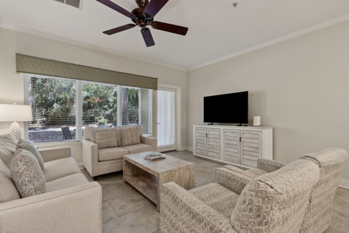First floor villa, two bedrooms, two full bath beautifully updated Villa, within walking distance of the beach. The open floor plan provides a spacious feel and leads you to the massive screened in deck with a tropical wooded view. The Villa also has a sleeper sofa that sleeps 2 more! Just steps from pool and tennis courts. fully stocked for cooking ,kitchen table that seats 6 and washer and dryer. High speed internet and 2 smart TV's. First building in the complex. Free parking