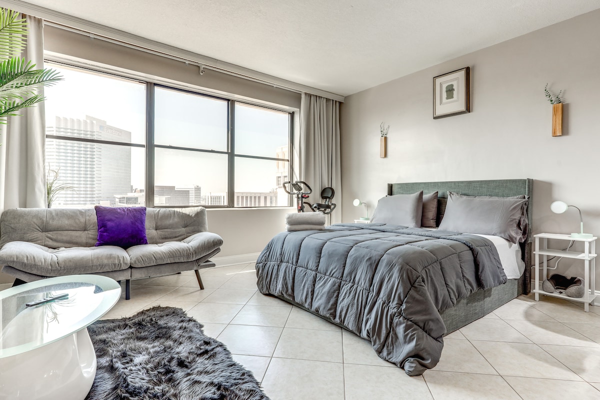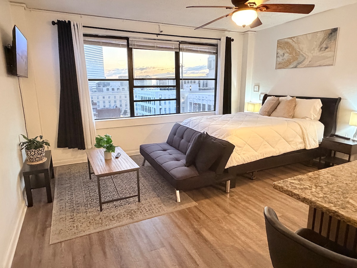 9th floor studio with spectacular views of Jacksonville and beautiful sunset. Building has 24-hr controlled access, fitness center, laundry room, billiards and internet café downstairs. Evening and weekend security on site. -Walking distance to Court House and Library, downtown concerts, restaurants, and Riverwalk. - 5 Minutes to Baptist MD Anderson Hospital. - 6 min to Wolfson Children. - 5 min to stadium TIAA BANK FIRLD. Free parking from 6pm-8am and weekends on the side of the building