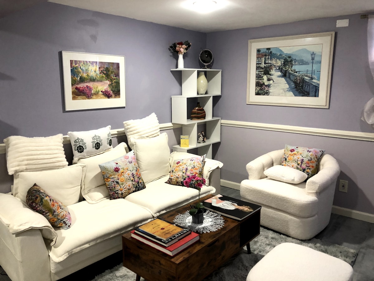 The Serenity Suite is a functionally designed, open concept, lower level space with its own PRIVATE entrance, kitchen, bedroom, bathroom and seating areas. With a clean contemporary design and furnishings, The Serenity Suite provides a cozy, serene and safe environment. Unwind and relax, in this newly renovated suburban Suite located 10 mins. from the UBS Arena and Belmont Park, 5 mins from the Belt and Southern State Parkways, 15 mins from JFK, 10 mins to LIRR and 25 mins to LGA.