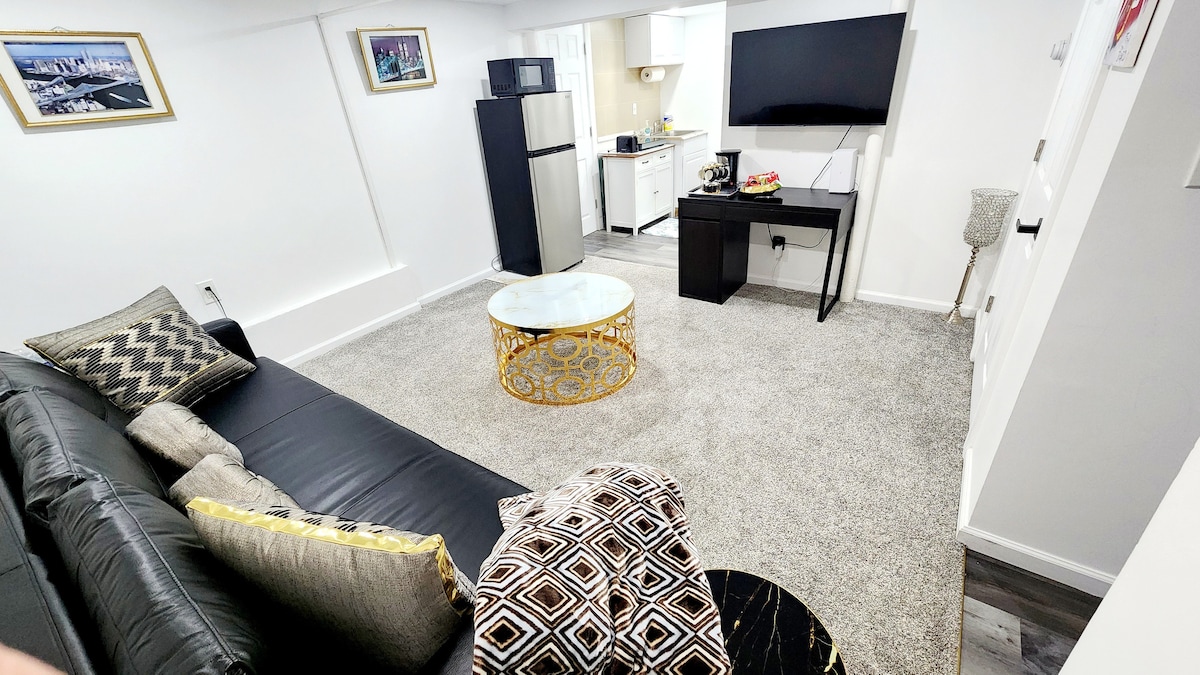 The Serenity Suite is a functionally designed, open concept, lower level space with its own PRIVATE entrance, kitchen, bedroom, bathroom and seating areas. With a clean contemporary design and furnishings, The Serenity Suite provides a cozy, serene and safe environment. Unwind and relax, in this newly renovated suburban Suite located 10 mins. from the UBS Arena and Belmont Park, 5 mins from the Belt and Southern State Parkways, 15 mins from JFK, 10 mins to LIRR and 25 mins to LGA.