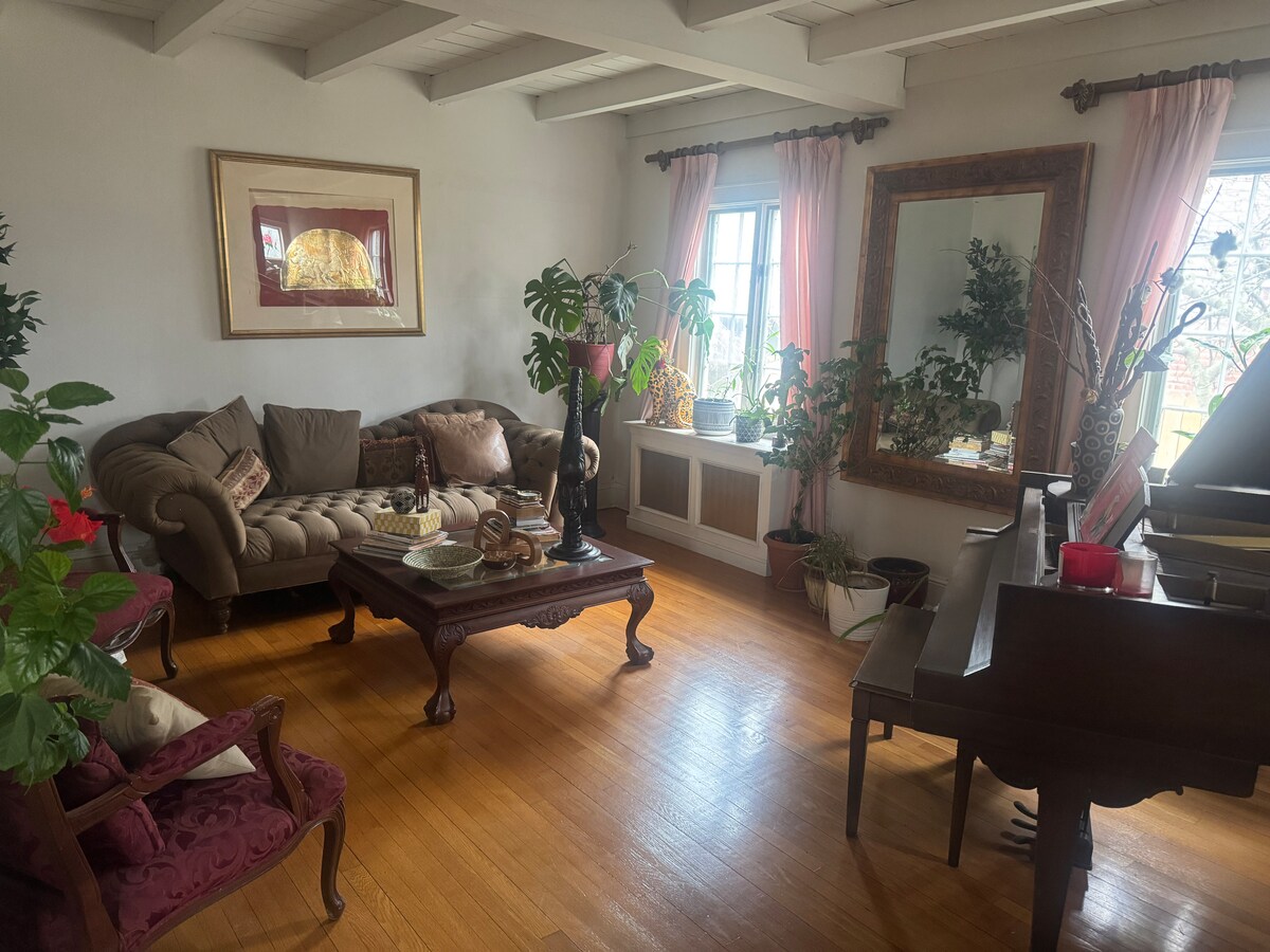 Dear guests, welcome to our cozy family home! Our comfortable house features two floors and has stairs. All 3 Bedrooms are located on the second floor. On the first floor we have: 1 Dining Room, 1 Kitchen, 1 Living Room with fireplace, 1 Office & Family Room, 1 Bathroom with Jacuzzi Bathtub, 1 Bathroom with walk-in shower and hydrotherapy jets. The neighborhood is quite, safe and there is free street parking. We are located 15 min by car from JFK Airport and 10 min walk to the train station.