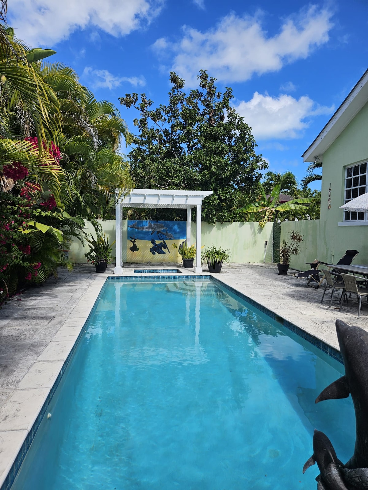 This charming 1-bedroom suite, nestled in a tropical paradise, is 1 of 2 separate units in a cottage for up to 2 adult guests (owner lives on property). Includes queen bed, 1 bath, kitchenette, swimming pool w/water feature, treehouse, hammocks, private guest entrance w/ security access code, & free parking. A 7 mins drive from airport, 5 mins drive to nearest beach, 5 mins walk to eateries, grocery store, pharmacy & ATM. Ideal for couples, solo travellers or friends. Rental car recommended.