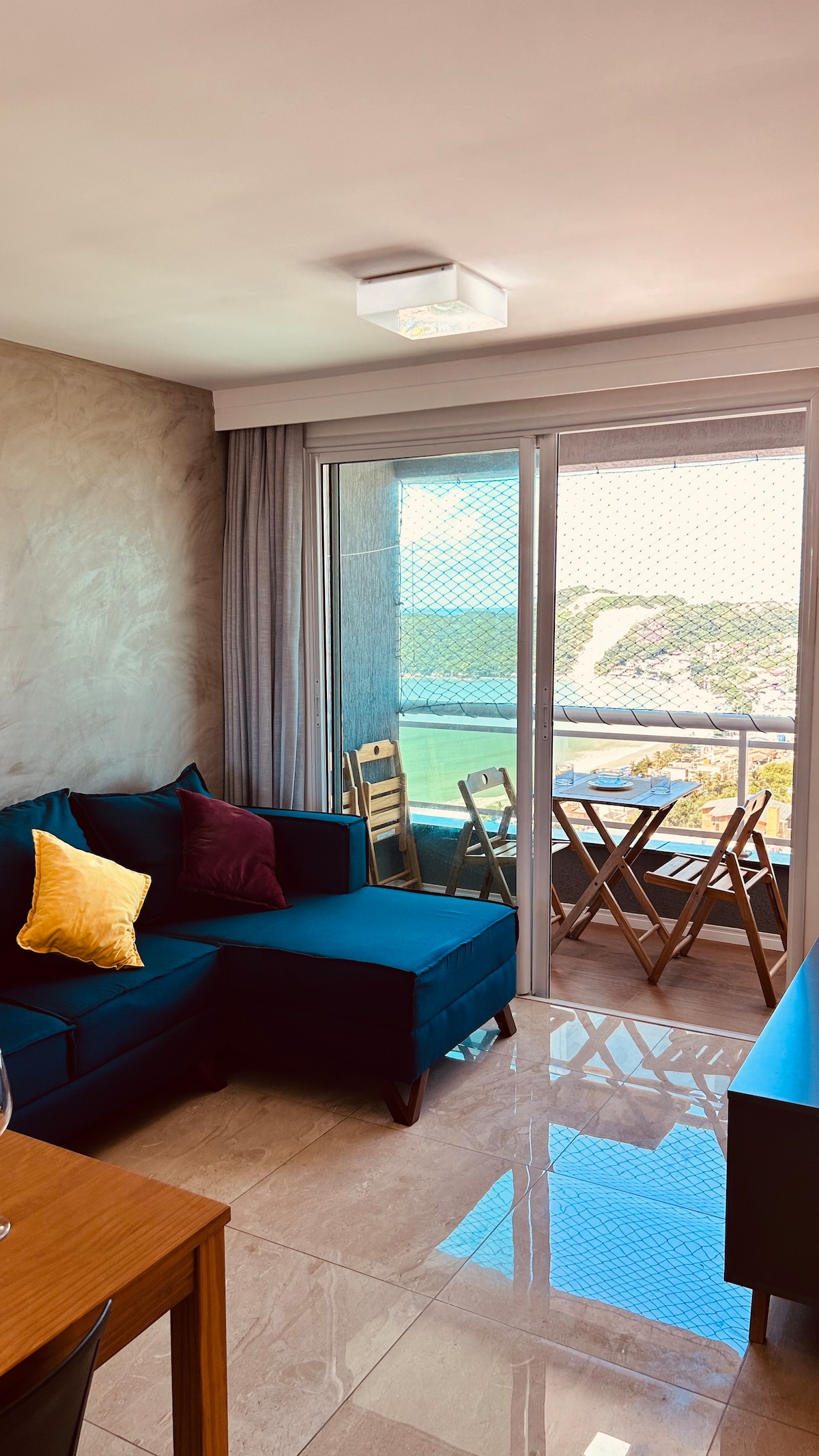Apartamento com móveis sob medida, espaçoso com amplo terraço com vista pro mar e jacuzzi (não tem aquecimento, porém pega sol o dia inteiro). No terraço há mesa e cadeiras para usufruir do clima e da vista. O apartamento conta com internet, smart TV e sofá-cama. Conta com todos os eletrodomésticos para que a estada seja confortável. Temos fogão de indução, microondas, air-fryer, geladeira, freezer e churrasqueira elétrica (mediante limpeza após o uso).