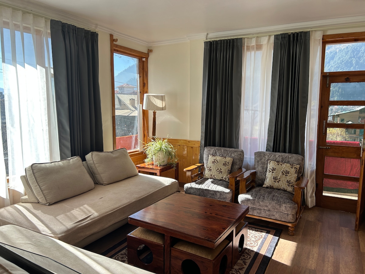 For those tired of following usual tourist trails & seeking out unique n less crowded destinations, Get yourself off the grid & indulge yourself in unforgetting experience @ our luxury 2-bedroom aptmnt that has got stunning aesthetics, offers unmatchable tranquility & opportunity to fully immerse oneself in the present moment. Situated at a height of 7500 ft, it offers breathtaking valley view with snow-dusted apple orchards, pine / deodar trees, sprawling mountain range & meandering beas river!