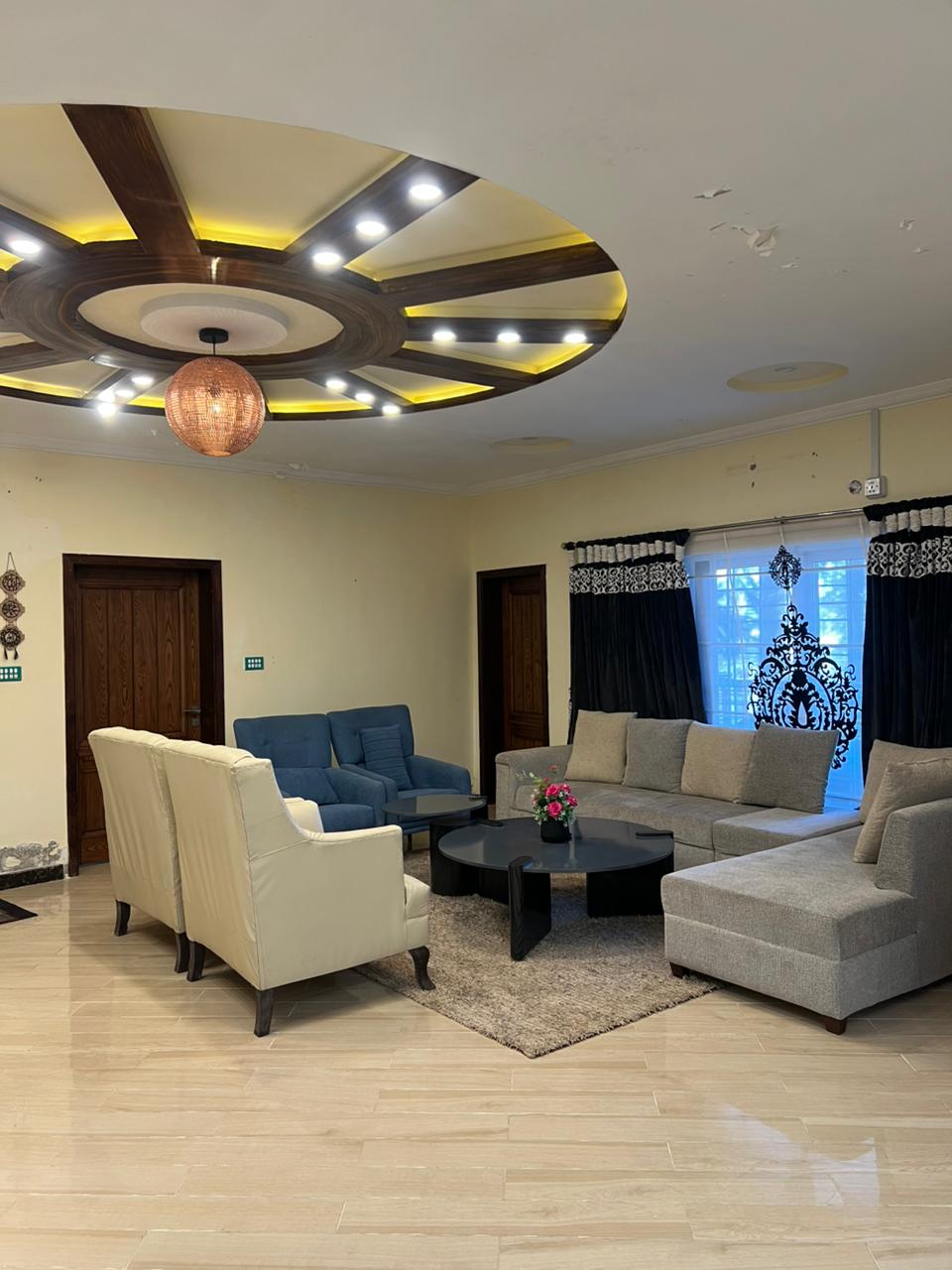 This is our five bedroom villa with five attach bath and kitchen living area dining area terris. wifi backup generator save parking hot water room service
