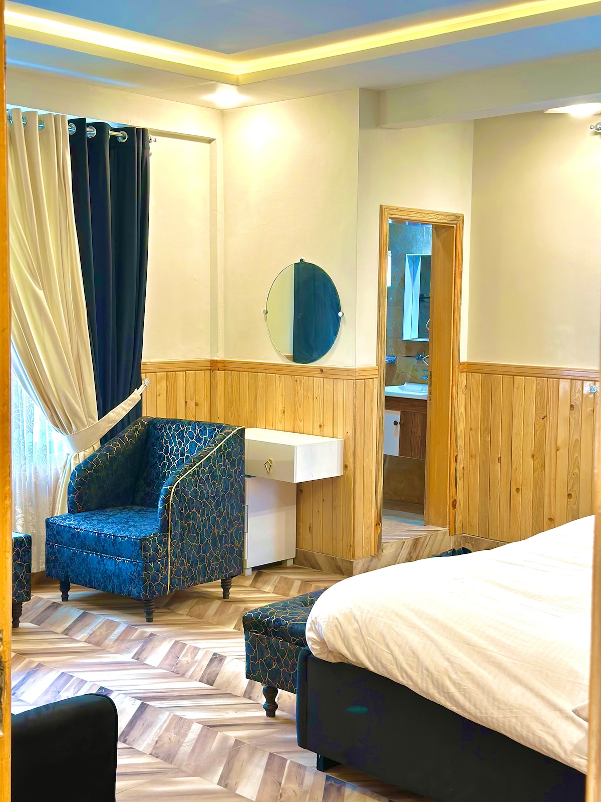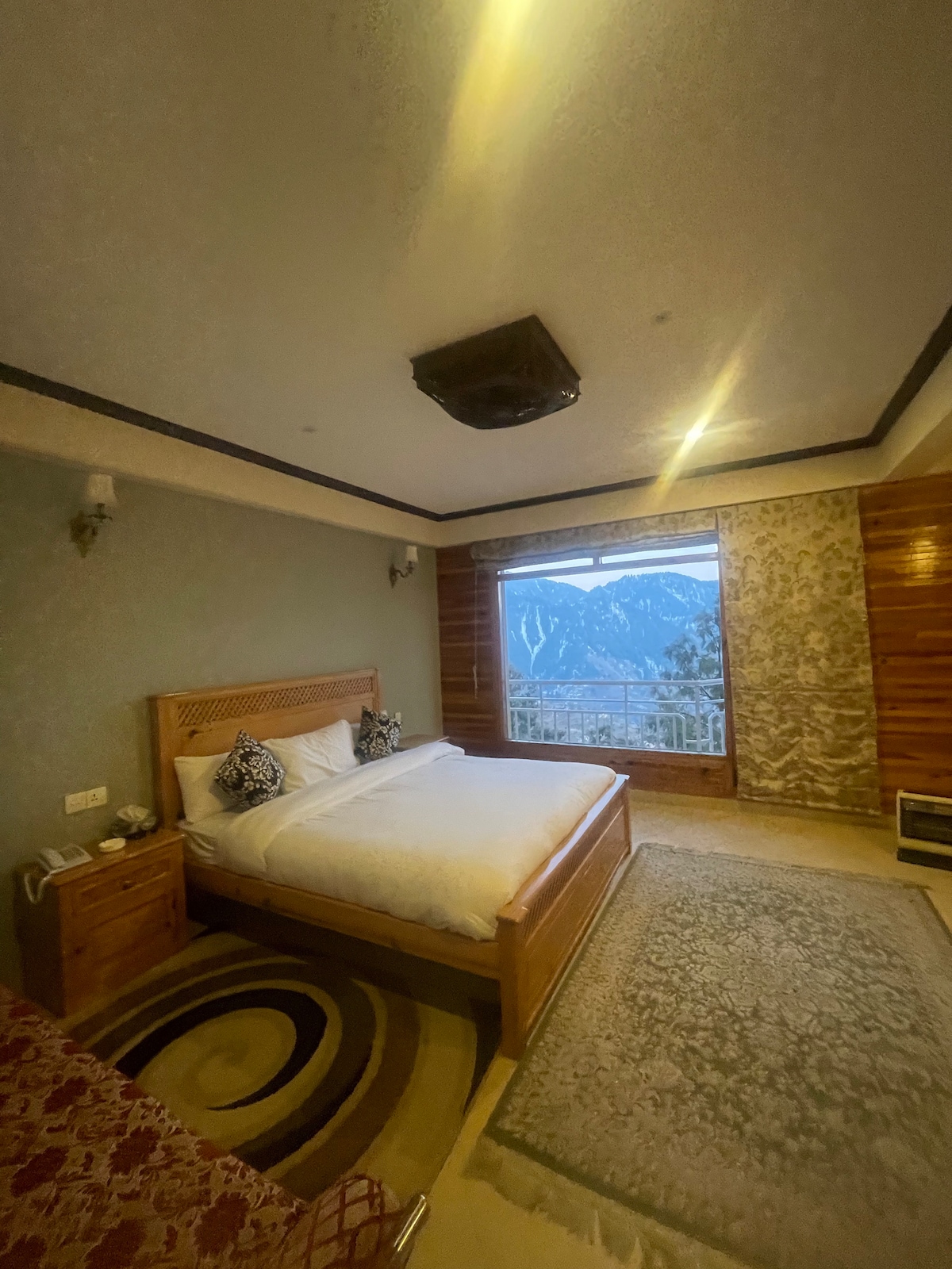 "deluxe room featuring stunning mountain views, a private balcony, modern comforts, and a warm, relaxing atmosphere. Ideal for couples and small families.” The attached modern bathroom includes hot and cold water, fresh towels, and premium toiletries. Daily housekeeping and reliable room service are provided to maintain a clean and comfortable environment throughout your stay. This room is ideal for couples, business travelers, or small families