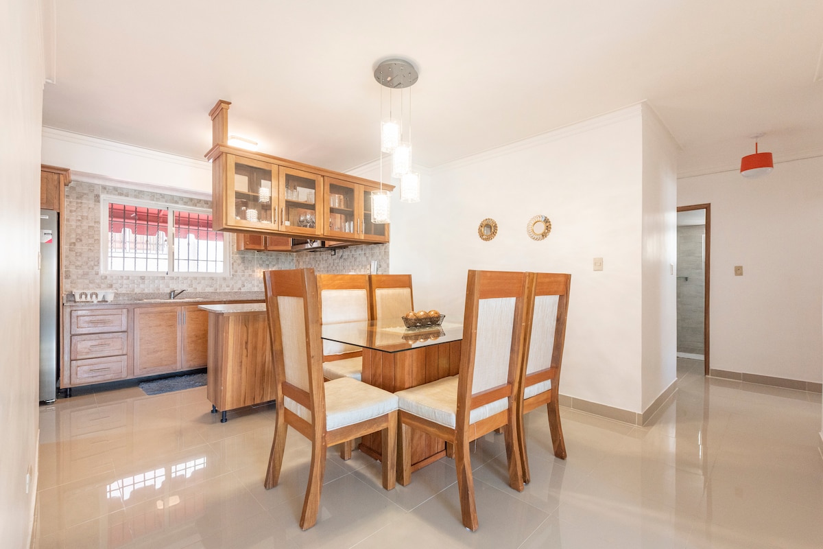 Ven y disfruta nuestro apartamento de 1 Hab. equipado completo, se encuentra en el centro de la ciudad de Santo Domingo y a corta distancia de los principales centros comerciales de la ciudad. - El apartamento es completamente tuyo. - 1 lugar de estacionamiento disponible. - Un Dormitorio con cama Queen, colchón, sábanas, edredón y almohadas - Smart TV LED solo en la sala. - Baño moderno. - Aire acondicionado en dormitorio y salón. - Agua caliente. - Lavadora y secadora. - Cocina completa.