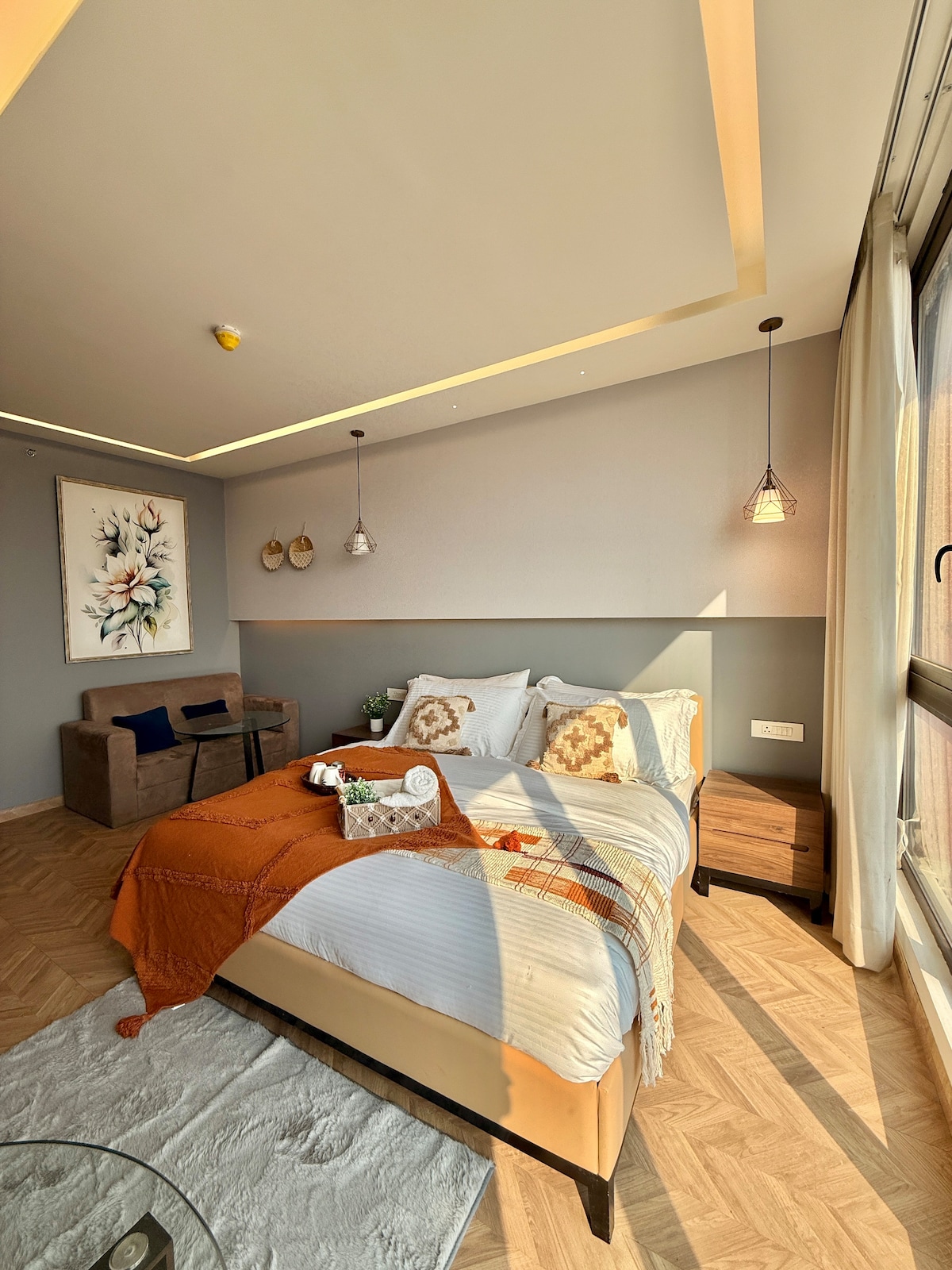 Indulge in the epitome of sophistication in this luxury studio apartment in the heart of South Delhi in Saket. Nestled in a prime location, Enjoy a tastefully furnished space, complete with luxurious decor and ample natural light. With a King Size Bed, Large screen 43" Smart TV, Fully functional pantry and a stylish washroom, every detail caters to a refined lifestyle. Immerse yourself in comfort & convenience. Welcome to a blend of luxury and urban living