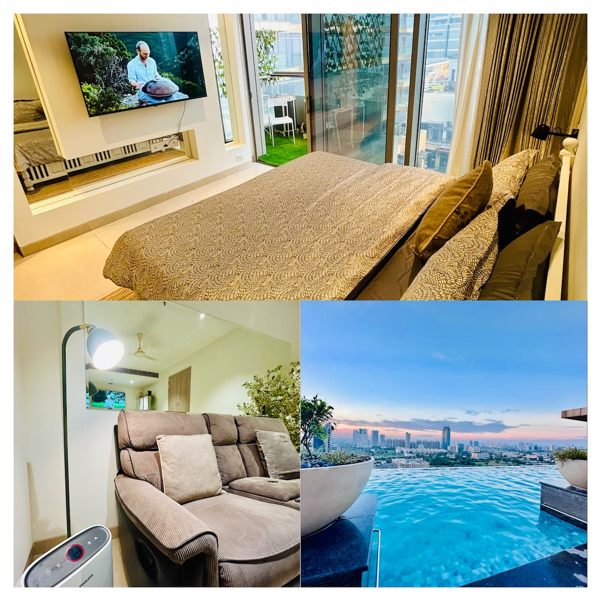 Introducing our exquisite luxury studio apartment: Nestled in the heart of the city, this opulent studio boasts modern elegance and unparalleled comfort. The open-concept design invites you into a spacious haven, bathed in natural light from the large windows that offer breathtaking city views. This apartment is on the 41st floor in one of the tallest sky scraper in Delhi - NCR. The apartment has a river facing view from the balcony!!