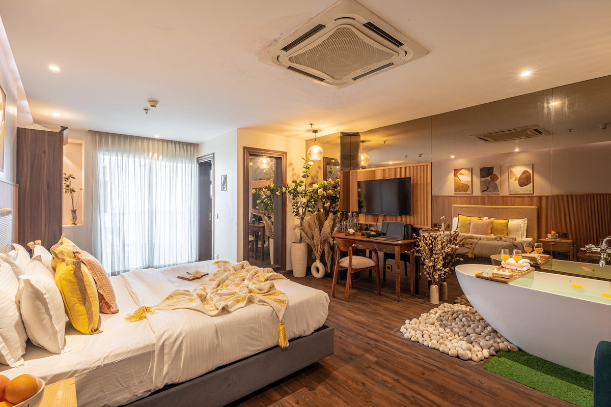 Kindly be informed that this is a studio apartment. Welcome to our studio apartment nestled in the lively Bani Park neighborhood of Jaipur. This stylish one-bedroom studio promises a lavish experience in the heart of the Pink City. With a king-size bed and a sofa-cum-bed the apartment comfortably accommodates three guests. Conceptualized and designed with wellness in mind, the apartment is dipped in neutral tones and soothing hues. Notably, it boasts a luxurious bathtub for your relaxation