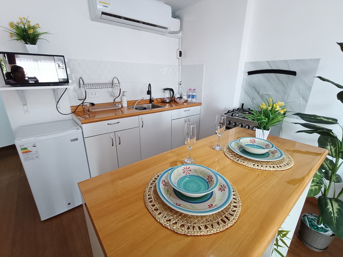 Disfruta de este mini departamento nordico, acogedor y con aire acondicionado para el verano y así tu estancia sea comoda, además esta a 10 minutos del aeropuerto internacional de Lima Perú, a 5 minutos a pie esta del centro comercial Mall Plaza Bellavista, ahí hay restaurantes, bancos, casa de cambio, cine, tiendas, supermercado, etc. también esta cerca a la Universidad San Marcos y Del Callao, zoológico, polideportivo del Callao, clínicas además aledaños a otros distintos turísticos.